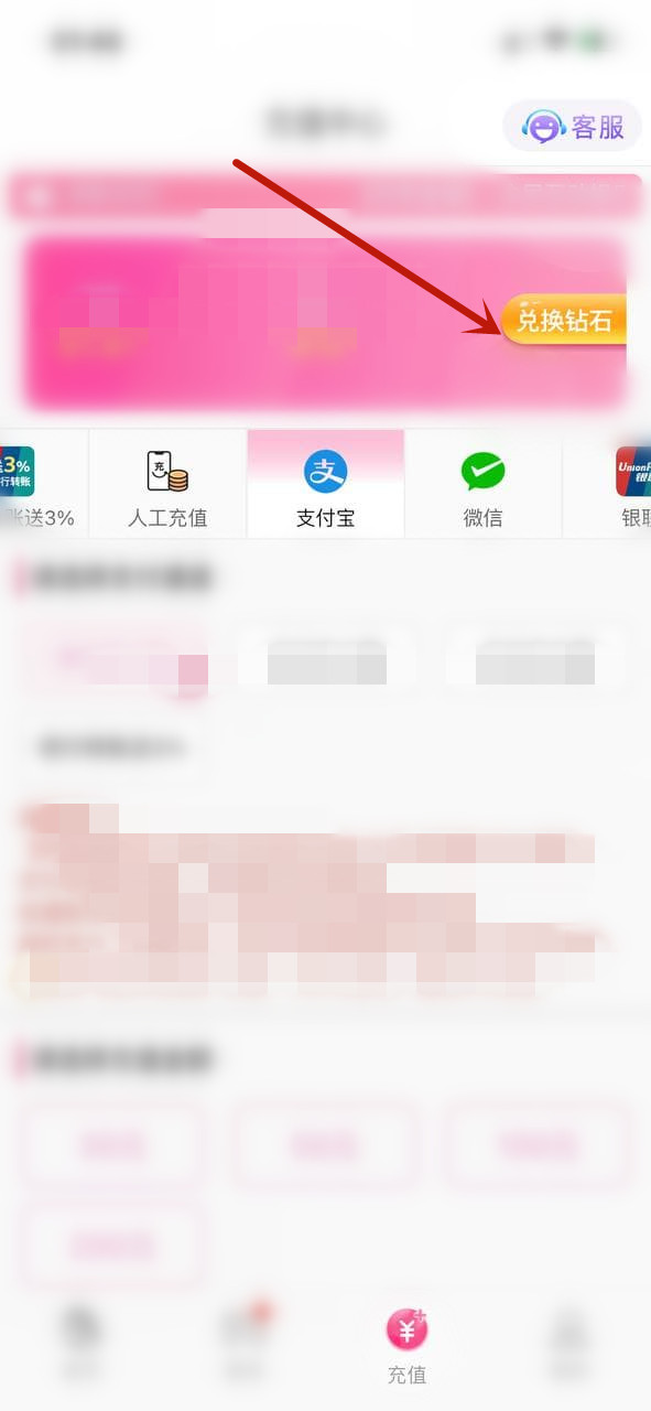 在【充值】页面成功充值之后,请点击上方的【兑换钻石】(箭头所指出),进入页面有多种价格的钻石供您选择兑换,根据金额兑换相应的钻石。